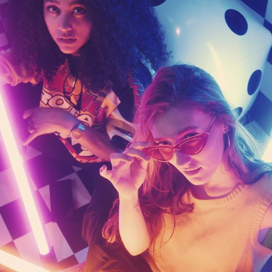 Urban girls between bars of colored light